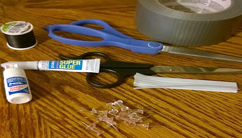 cheap stuff), super glue, wire twist ties, zip ties, and thumb tacks. Sometimes I even buy and keep